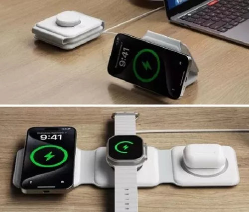 La Base de Carga Inalámbrica Plegable 3 en 1 es la solución perfecta para cargar tus dispositivos móviles de forma rápida y conveniente. Con capacidad de carga rápida y compatibilidad con dispositivos Android e iPhone, este cargador inalámbrico es versátil y eficiente. Además, su diseño plegable lo hace ideal para llevarlo contigo a donde quiera que vayas. El modelo 3 en 1 Charger cuenta con un conector Tipo C y viene con un cable incluido para una mayor comodidad. Su voltaje de salida garantiza una carga eficiente y segura para tus dispositivos. Además, al ser inalámbrico, te permite cargar tus dispositivos sin necesidad de cables enredados. Ya no tendrás que preocuparte por llevar varios cargadores para tus dispositivos, con la Base de Carga Inalámbrica Plegable 3 en 1, tendrás todo lo que necesitas en un solo dispositivo. Aprovecha la tecnología de carga rápida y la comodidad de la carga inalámbrica para mantener tus dispositivos siempre listos para usar.Protección segura y múltipleCargador inalámbrico 3 en 1 con certificación QI, simplemente coloque su dispositivo en el cargador y el estabilizador, el chip inteligente incorporado protegerá su teléfono de sobrecarga, sobre corriente y sobrecalentamiento, seguro de usar.Fácil de transportarEl cargador inalámbrico plegable reemplaza 3 dispositivos de carga y es la opción preferida para negocios/viajes/vacaciones, se pliega para caber en su bolsillo o equipaje, las tres placas de carga se fijan firmemente mediante *fuerza magnética* para ahorrar más espacio. BASE / ESTACIÓN DE CARGA INALÁMBRICA / COMPATIBLE CON DISPOSITIVOS APPLE / iPhone , Apple Watch,AirPods y Celulares Android con esta tecnología.